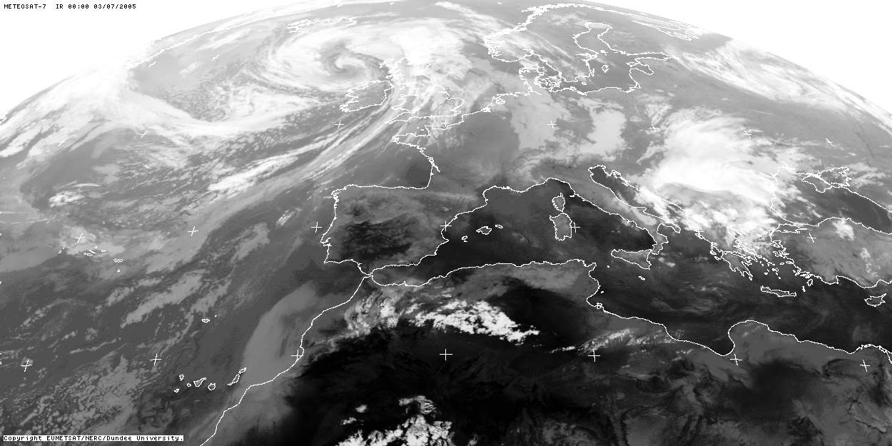 Das Satellitenbild zeigt ein markantes Tief bei Irland sowie eine Gewitterzone über Griechenland und auf dem Balkan. Über Deutschland und Polen liegen die Restwolken zweier Frontalzonen. Absolut sonniges und zum Teil sehr warmes Wetter in Spanien, die hohen Temperaturen dort spiegeln sich in der dunklen Einfärbung wieder.