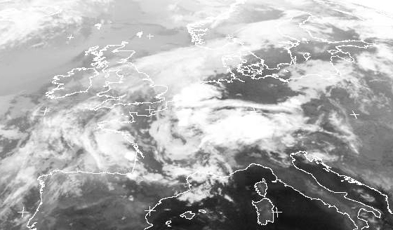 Der Ausschnitt zeigt das Tief bei Frankreich und die Gewitter über Deutschland genauer. Der Kontrast zwischen dem wolkenfreien Norden und den Wolken im Süden ist schlagend. Das Wolkenband über der Nordsee gehört zur einer Kaltrfont die sich im Lauf des Tages von Nordwesten nach Norddeutschland hineinbewegen wird.