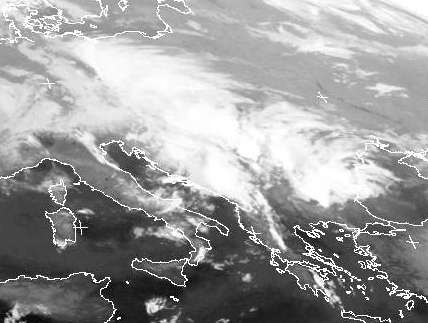 Der Ausschnitt zeigt die Frontalzone über dem Osten Europas etwas genauer. Man erkennt zum Teil deutlich den Einfluß der Orographie auf das Wetter, zum Beispiel in Griechenland - dort entstehen Gewitter bevorzugt entlang der größeren Gebirgsketten im Westen und Osten.