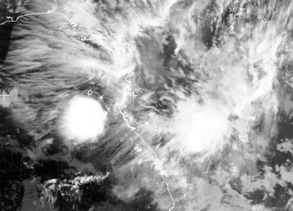 Wie zwei Augen stechen zwei tropische Gewitterschauer aus dem Satellitenbild von Donnerstag früh hervor. Sie befinden sich im Golf von Guinea, an der Afrikanischen Westküste nahe Gabun, beziehungsweise über dem Kongo und Zaire. Durch eine labile Schichtung entstehen hohe Wolkentürme deren sehr kalte Wolkenoberkanten weiß hervorstechen.