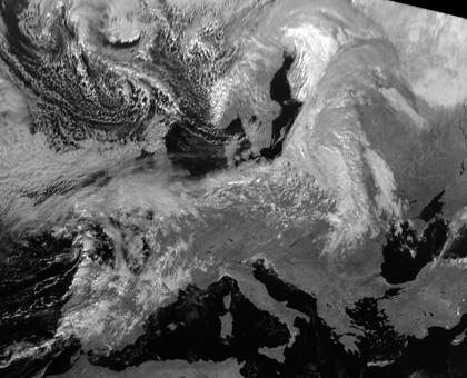 Auf dem Satellitenbild ist sehr schön die Struktur eines Tiefdruckgebietes über dem Nordatlantik zu erkennen. In der labilisierten Kaltluft sind die typischen zellulären Wolkenstrukturen erkennbar.
