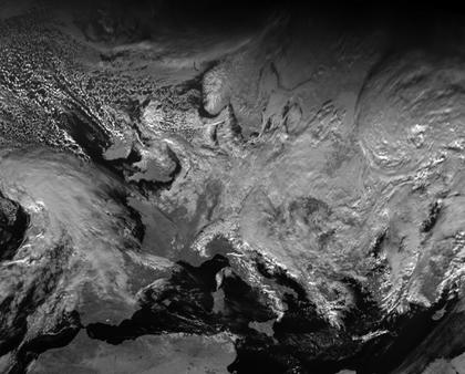 Während sich in Mitteleuropa im Einflussbereich von Tief 'Annette' mit Zentrum über den Benelux-Ländern dichte Wolken halten, ist es in großen Teilen Westeuropas unter Einfluss von Hoch 'Arthur' gering bewölkt. Deutlich sind die westlichen Alpen mit den großen Alpenseen sowie verschneiten Bergen und Schnee der bis in die Täler reicht zu erkennen.