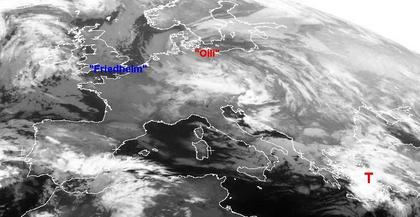 Das Tief 'Oili' liegt über Ostdeutschland und lenkt mit einer nördlichen Strömung feucht-kalte Meeresluft nach Mitteleuropa. Auch in Süditalien und Griechenland, sowie auf der Iberischen Halbinsel sorgen Tiefsruckgebiete für Niederschläge, teils als Regen, teils als Schnee. Von Südfrankreich bis zu den Britischen Inseln bringt das Hoch 'Friedhelm' eine Wetterberuhigung.