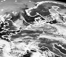 Auf dem Satellitenbild vom Freitagmittag liegen noch viele Wolken über Deutschland. Es handelt sich um die Reste der Bewölkung von Tief 'Ingo'. Über der Nordsee liegt bereits das Hoch 'Olga'. Gebietsweise, vor allem nach England hin, findet man hier aber auch dichtere, hochnebelartige Bewölkung. In Deutschland wird es jedoch am Wochenende bis auf verbreiteten Frühnebel kaum dichtere Wolken geben. (Bildquelle: NERC Satellite Receiving Station, Dundee University, Scotland, http://www.sat.dundee.ac.uk/)