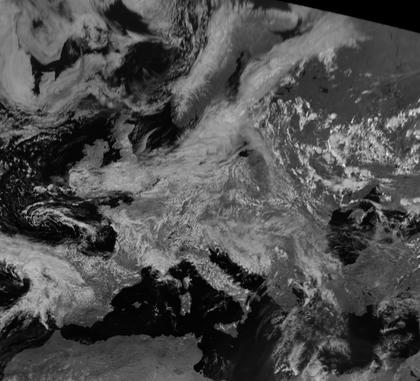 Hoch 'Rene' sorgt über Nord und Nordosteuropa für wolkenarmes Wetter. Die verschneiten Berge des Skandinavischen Gebirges, die Kola-Halbinsel und die Seen des Nordrussischen Tieflands sind zu erkennen. Mitteleuropa von dichten Wolken bedeckt, teilweise handelt es sich hierbei um Hochnebel. Über der Kurischen Nehrung befindet sich mit seinem Zentrum Tief 'Valiska'
