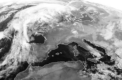 Das Satellitenbild zeigt ein Hochdruckgebiet über Mitteleuropa, das verbreitet freundliches Winterwetter bringt. Über den britischen Inseln liegen die Wolken einer Warmfront eines Tiefs bei Island. Im östlichen Mittelmeer liegt ein weiteres Tief und saugt kalte Festlandsluft an, wodurch sich hier verbreitet Schauer und gelegentlich auch Gewitter bilden.