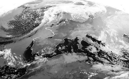 Das Satellitenbild zeigt eine Hochdruckbrücke, die sich von Frankreich über Mitteleuropa bis weit nach Rußland erstreckt. Nördlich von Irland liegt ein Tief das auf seiner Vorderseite etwas mildere Luft nach Norde, auf seiner Rückseite kalte Luft nach Süden führt. Im östlichen Mittelmeer fließt kalte Festlandsluft vom Balkan über den Bosposrus nach Süden und erzeugt 'el Meknessa' - das für diese Jahrsezeiz typische Tief mit unbeständigem Wetter im östlichen Mittelmeerraum.