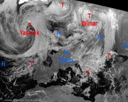 Auf dem heutigen Satellitenfoto zeigt sich das Hoch 'Xenia' über Mitteleuropa. Mit seinem Einfluss sorgt es von der Iberischen Halbinsel, über Frankreich, die Mitte Europas bis ins westliche Osteuropa für meist trockenes und teils freundliches Wetter. Kräftige Tiefdruckgebiete sorgen hingegen von den Britischen Inseln, über Skandinavien bis nach Nordwestrussland für häufigen Regen, nach Norden und Osten hin auch für Schnee. Auch vom zentralen Mittelmeer bis in den Südosten Europas sorgt Tiefdruckeinfluss für häufig dichte Wolken und zeitweilige Schauer, teils auch für Gewitter.
