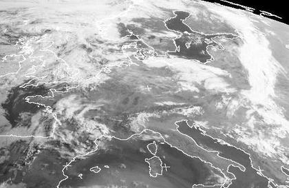 Unter dem Einfluss von 'Yves' ist es in Deutschland meist gering bewölkt. Die letzten Wolken im Nordosten sind auf die Ostsee abgezogen. Über den Britischen Inseln und der Nordsee sind durch Tiefdruckeinfluss mehr Wolken entstanden. Sie streifen auf ihrem Zug nach Nordosten nur den äußersten Nordwesten Deutschlands. Über Südfrankreich erkennt man Schauer- und gewitterbewölkung. Vor allem in der Nacht zu Montag kommt es auch in Deutschland zu Gewittern. (Bildquelle: NERC Satellite Receiving Station, Dundee University, Scotland, http://www.sat.dundee.ac.uk/)