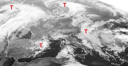 Von Südwestfrankreich bis Polen sorgt Hoch 'Michi' für freundliches Wetter mit nur wenigen Wolken. Im Norden und Süden dieses Hochs sind auf dem Satellitenbild von Donnerstag früh einige Tiefdruckgebiete zu erkennen, die örtlich Regen bringen.