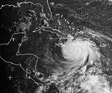 Auf dem Satellitenbild vom Sonntagmorgen (Ortszeit) erreicht die Wolkendecke von Hurrikan 'Dean' gerade den Osten Jamaikas. Er überquert die Insel und dann weiter nach Westen. Am Montag liegt er etwa über den Cayman-Inseln. Er erreicht mittlere Windgeschwindigkeiten von 240 km/h und Böen bis 300km/h. In der Nacht zu Dienstag erreicht er nach den letzten Berechnungen die mexikanische Halbinsel Yucatan. (Bildquelle: NERC Satellite Receiving Station, Dundee University, Scotland, http://www.sat.dundee.ac.uk/)