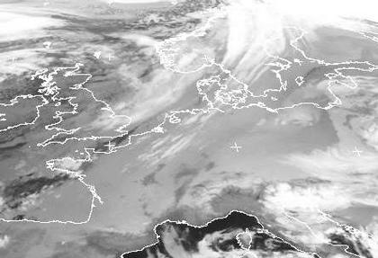 In Deutschland kündigt sich langsam eine Wetterumstellung an. Noch sorgt Hochdruckeinfluss für einen gleichmäßige, niedrige Wolkendecke, aus der nur die Vogesen und Voralpenland örtlich herausschauen. Von Nordwesten her zieht jedoch schon ein dünner Streifen hoher Cirruswolken über die niedrigeren Wolkenschichten hinweg. Er gehört zur Warmfront von Tief 'Wolfram' über dem Polarmeer. Die hohen Wolken eilen der Bodenfront um mehr als 300 km voraus, die Bodenfront befindet sich auf diesem Bild erst auf der Nordsee zwischen Südnorwegen und Südengland.