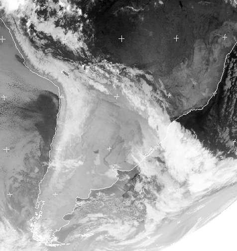 Eine Kaltfront, deren Bewölkung gut zu erkennen ist, hat sich östlich der Anden nordwärts bewegt. Auf ihrer Rückseite ist es mit etwa 10 bis 15 Grad um etwa 15 Grad kälter als auf ihrer Vorderseite.