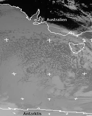 Ein ausgedehntes Tiefdruckgebiet lenkt Kaltluft von der Antarktis bis zur Südküste Australiens. Allerdings hat sich die Luft auf ihrem langen Weg von der Antarktis stark erwärmt, denn auf der Südhalbkugel ist fast Sommer.