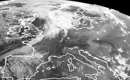 Tief 'Ute' liegt mit seinem Zentrum nördlich von Schottland. Seine Kaltfront ist an dem Wolkenband zu erkennen, das sich über die Nordsee und bis in die Biskaya erstreckt. In weiten Teilen Deutschlands ist es noch gering bewölkt. Mit Annähern der Front kommt es dann aber zu Gewittern. (Bildquelle: NERC Satellite Receiving Station, Dundee University, Scotland, http://www.sat.dundee.ac.uk/)