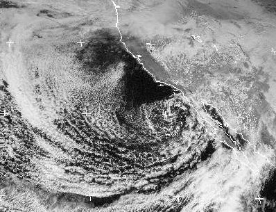 Südwestlich von Kalifornien liegt das Zentrum eines alten Tiefdruckgebiets. Von Norden lenkt es kalte Luft nach Süden. Dabei bilden sich direkt an der Küste, über kaltem Wasser, noch keine Schauerwolken. Dort ist es meist wolkenlos. Erst über etwas wärmerem Wasser weiter auf dem Pazifik kommt es zur Wolkenbildung.