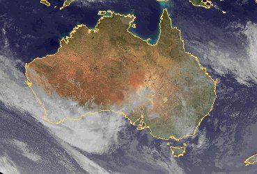 Hochdruckeinfluss sorgt im Norden von Australien für meist wolkenfreies Wetter, im Osten gibt es in etwas feuchterer und kühlerer Luft einige lockere Wolken mit vereinzelt möglichen Schauern. Von Südwesten zieht ein Tiefausläufer mit seinen dichten Wolken auf den Kontinent.