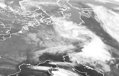 Der Ausschnitt zeigt das Tief über Böhmen genauer, man erkennt sehr schön den Vorstoß kalter Meeresluft von der Nordsee her nach Deutschland. Auf dem Balkan haben sich kräftige Gewitter gebildet.