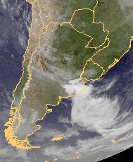 Auf dem Satellitenfoto von heute Nachmittag ist ein kräftiges Tiefdrucksystem mit Zentrum an der argentinischen Atlantikküste zu erkennen. In dieser Region kommt es heute verbreitet kräftigen und teils ergiebigen Niederschlägen und Gewittern.