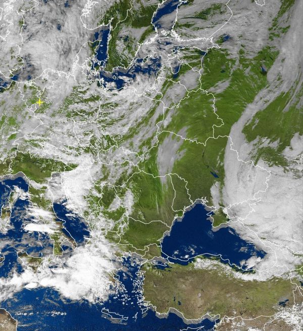 Auf dem Satellitenfoto von heute mittag sind die dichten Wolken eines Tiefdruckgebiets südöstlich von Italien auszumachen. Diese hochreichenden Wolken bringen verbreitet zum Teil kräftige Schauer und Gewitter und ziehen im weiteren Verlauf weiter nach Osten in Richtung Ägäis, in den nächsten Stunden ist aber auch an der Adria noch regional mit starken Schauern und Gewittern zu rechnen.