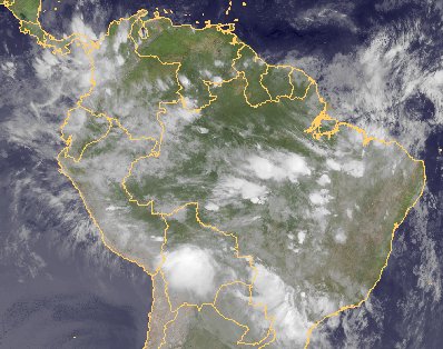 Über Brasilien haben sich kräftige Schauer und Gewitter entwickelt. Diese entstehen jahreszeitlich bedingt in Zusammenhang mit der innertropischen Konvergenzzone.