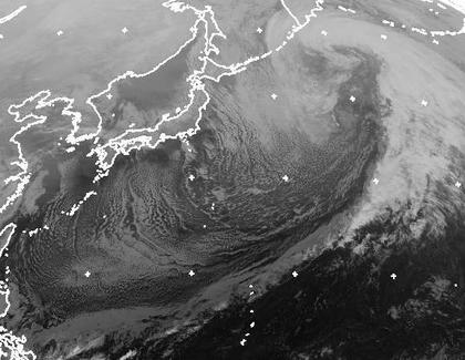 Die langgezogene Kaltfront eines Sturmtiefs bei Kamtschatka ist über dem Pazifik schon weit nach Süden gezogen. Auf ihrer Rückseite strömt kalte Luft von Sibirien südwärts. Über dem Meer bilden sich dabei lockere Quellwolken.