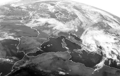 Das Satellitenbild zeigt ein Hoch über dem westlichen Mittelmeer und ein Tief westlich von Norwegen. An der Grenze zwischen diesen beiden liegt ein Wolkenband in dem sich ein kleines Randtief über dem Ärmekanal bildet. In Rußland erkennt man ein gealtertes Tief, während das kräftige Tief bei Griechenland kurz vor dem Höhepunkt seiner Entwicklung steht.