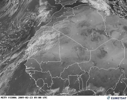 Auf dem Satellitenbild vom Nordwesten Afrikas ist der Großteil des Ausschnitts wolkenfrei. Nur in Mittelmeernähe im Bereich zwischen Algier und Tunis kann es bei teils dichter Bewölkung einzelne Schauer geben. Einige Wolken, die allerdings kaum Regen bringen, befinden sich in der Westsahara und in der Nordwesthälfte Mauretaniens. Sonst bleibt es überall trocken.