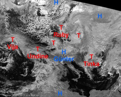 Das heutige Satellitenbild zeigt Tiefdrucksysteme von der Iberischen Halbinsel, von Großbritanien bis nach Skandinavien und in Südosteuropa. In diesen Gebieten fällt unter vielfach dichten Wolken verbreitet Regen, nach Nordosten hin fällt überwiegend Schnee. Auch in den anderen Gebieten Europas, die teils unter Hochdruckeinfluss stehen, halten sich häufig viele, meist aber weniger dichte Wolken, hierbei bleibt es auch meist trocken. Am freundlichsten und weitgehend trocken ist es vom zentralen bis östlichen Mittelmeer.
