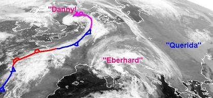In weiten Teilen Mittel-, West- und Südeuropas überwiegt Tiefdruckeinfluss. Von der Nordsee über Frankreich bis nach Nordspanien erstreckt sich das Frontensystem des Tiefs 'Danny' bei Schottland. Über Norditalien erkennt man an einer Wolkenspirale das Tief 'Eberhard', es bringt teils kräftige Schauer und Gewitter im ganzen Land. Das Hoch 'Querida' mit Zentrum über dem Schwarzen Meer sorgt für ruhiges, teils heiteres, teils trübes Wetter in Osteuropa sowie auf dem Balkan, gebietsweise kann man hochnebelartige Wolkenfelder erkennen.
