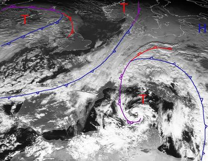 Das Mittelmeertief 'Verena' bringt heute dichte Wolken und Regen am zentralen Mittelmeer und vor allem an der Adria. Aber auch im Südosten von Deutschland ziehen Wolken des Tiefs durch. Dagegen ist im Nordwesten Deutschlands ein Ausläufer des Tiefs 'Waltraud' über dem Nordmeer angekommen. Seine Wolken reichen dabei bis nach Nordspanien. Bei Island befindet sich schon das nächste Tief namens 'Yvonne', das dann morgen auf Mitteleuropa übergreift. (Bildquelle: Copyrigt EUMETSAT, NERC Satellite Receiving Station, University of Dundee)