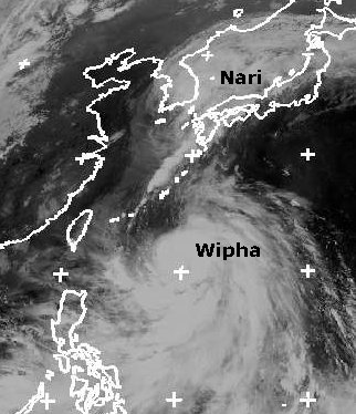 Während sich der ehemalige Taifun 'Nari' über dem Japanischen Meer rasch abschwächt, hat sich über dem Pazifik der neue tropische Sturm 'Wipha' gebildet. Er erreicht am Sonntag Windgeschwindigkeiten bis 85 km/h, in Böen auch bis 110 km/h. Er wird sich allerdings deutlich verstärken und zieht dabei nordostwärts ins Ostchinesische Meer. Dabei könnte er in der Nacht zum Dienstag auch Taiwan streifen. Seine weitere Zugbahn ist noch unsicher, voraussichtlich nimmt er, wie zuvor 'Nari', Kurs auf Korea. (Bildquelle: NERC Satellite Receiving Station, Dundee University, Scotland, http://www.sat.dundee.ac.uk/)