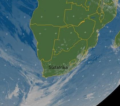 Große Teile des südlichen afrikanischen Kontinents zeigen sich heute Mittag wolkenlos oder gering bewölkt. Vereinzelte Quellwolken bringen keine Schauer. Lediglich der Süden und Südosten von Südafrika wird von Wolken eines Tiefs südlich des Kontinents gestreift. Zum Teil kann es hier auch leicht regnen. (Bildquelle: Copyrigt EUMETSAT, NERC Satellite Receiving Station, University of Dundee)