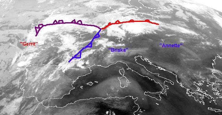 Hinter der Warmfront des Tiefs 'Gerrit' an der Westseite des Ärmelkanals strömt zunehmend warme und feuchte Luft aus dem Süden bis zur Ostsee. In dieser feuchten Luftmasse können sich heute immer wieder Schauer und Gewitter bilden. Die Okklusionsfront des Tiefs liegt genau über Großbritannien und sorgt dort für zum Teil kräftigen und gewittrigen Regen. Im Süden und Osten sorgen die beiden Hochs 'Annette' und 'Brisca' für einen fast wolkenfreien Himmel.