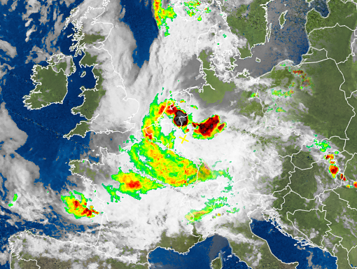 Über Nacht zogen die Unwetter in nördliche und westliche Richtung weiter und erreichten in den frühen Morgenstunden auch die Grenze zu den Niederlanden. Nach Durchzug der Kernzelle des Tiefs, zogen im Tagesverlauf weitere Schauer über den Süden und die Mitte des Landes hinweg. Lediglich im Nordosten blieb es bisher weitgehend trocken. Daür ist ein Hoch über Finnland verantwortlich, das trockene Luftmassen bis in den Ostseeraum befödert.