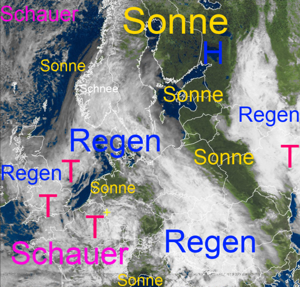 Mehrere kleinere Tiefs bilden ein Zentraltief welches über West- und Mitteleuropa reichlich Regen- und Schauerwolken produziert, die zu einem durchwachsenen und kühlen Witterungsabschnitt führen. Dazwischen findet man allerdings auch einige sonnige Aufheiterungen.