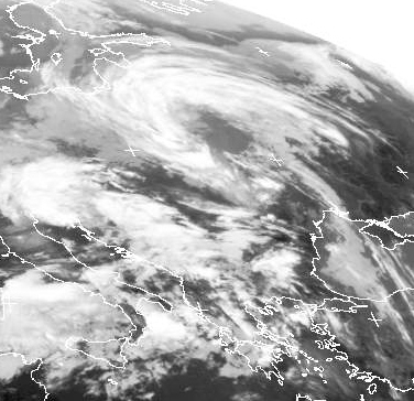 Der Ausschnitt zeigt das Tief 'Bruno' mit Zentrum über Weißrussland, vom Zentrum des Tiefs bis zum Schwarzen Meer und Balkan erstreckt sich seine Okklusionfront (die Kaltfront hat die Warmfront eingeholt), die Warmfront reicht bis nach Westrussland. Über dem Balkan halten sich viele Haufenwolken, die für kräftige und gewittrige Schauer in der Region sorgen.