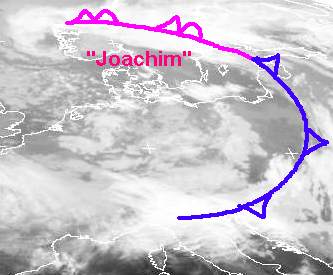 Auf der Rückseite des Höhentiefs 'Joachim' mit Zentrum über Skandinavien und dem Baltikum fließt feucht-kühle Meeresluft nach Mitteleuropa ein, in der sich vermehrt Schauerwolken entwickeln; auf dem Sattelitenbild sind sie sehr gut über Deutschland und Polen sowie über der Nordsee zu erkennen.