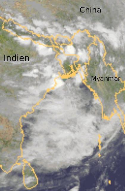 Schauer- und Gewitterzellen zeigt das Satellitenbild von heute Mittag über vielen Teilen am und rund um den Golf von Bengalen. Vor allem im nördlichen und nordöstlichen Indien, Bangladesh und Myanmar haben sich teils kräftige Gewitter gebildet, hier erscheinen die Wolken besonders intensiv weiß, was ein Zeichen für hoch reichende Wolken ist. Die teils starken Niederschläge werden auch in den kommenden Tagen anhalten, da die Sommerzeit hier gleichzeitig auch die Regenzeit ist.