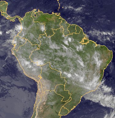 Auf dem Satellitenbild vom nördlichen Südamerika sind Schauer- und Gewitterzellen erkennbar. Diese entwickeln sich im Bereich der innertropischen Konvergenzzone.
