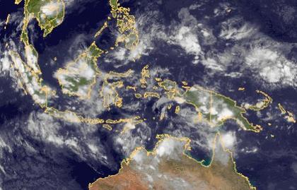 Von Sumatra bis Neuguinea entwickeln sich im Bereich der innertropischen Konvergenzzone kräftige Schauer und Gewitter, deren Zellen im Satellitenbild deutlich zu erkennen sind.