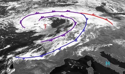 Die Wolken des Tiefs 'Naruporn' mit seinem Zentrum über den Britischen Inseln erfassen weite Teile Mittel- und Nordwesteuropas. Während es im Bereich der Okklusion und Warmfront häufig zu Regenfällen kommt, bringt die Kaltfront Schauer und Gewitter. Eine zweite Okklusion hinter der Kaltfront kann ebenfalls für Gewitter sorgen, eine größere Zelle ist hier im Frühstadium über den südlichen Niederlanden zu sehen. (Bildquelle: Copyrigt EUMETSAT, NERC Satellite Receiving Station, University of Dundee)
