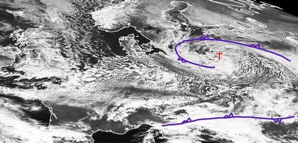 Während über Polen das Schneetief 'Johanna' mit seinen Wolken häufig Schneefälle bringt, ziehen in einer nordwestlichen Strömung von der Nordsee kommend viele Schauerzellen nach Mitteleuropa und nach Deutschland. Am südwestlichen Skandinavischen Gebirge zeigen die hellen Flecken die schneebedeckten Gebiete an. Während sich die Wolken hier stauen, behindern die Berge die Wolken auf dem Zug nach Süden, so dass hier wie so oft in einer solchen Konstellation eine Zone mit wenigen Wolken entsteht, die sich bis nach Nordostdeutschland erstreckt. (Bildquelle: NERC Satellite Receiving Station, Dundee University, Scotland, http://www.sat.dundee.ac.uk/)
