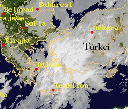 Dichte Wolken zeigen sich heute Mittag über dem Westen der Türkei und einigen Teilen Griechenlands. Ursache dafür ist das Tief 'Volker' über dem Schwarzen Meer, dass zugleich kalte Luft aus Norden herangeführt hat. Folge davon sind einige Gewitter oder Regen in dieser Region. Ungewöhnlicherweise fiel an Teilen der Ägäis sogar Schnee.