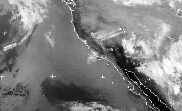 Über der Wüste Arizonas liegt Schauerbewölkung. Vor der Küste Kaliforniens eine niedrige Wolkendecke.