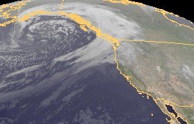 Das Satellitenbild von heute Vormittag zeigt ein ausgedehntes Tiefdrucksystem vor der kanadischen Pazifikküste. Dabei bringen die Ausläufer des Tiefdruckgebiets vor allem in den küstennahen Gebieten bis hin zur us-amerikanischen Pazifikküste vielfach starken Regen und teils stürmischen Wind.
