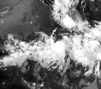 Auf dem Pazifik, abseits aller Küsten, liegt der tropische Sturm 'Bud'. Er liegt auf dem Bild etwas links der Bildmitte. Er liegt mitten im Gürtel tropischer Schauer und Gewitter, der sich über den Pazifik erstreckt. 'Bud' hat zurzeit erst eine mittlere Windgeschindigkeit von 65 km/h, wird sich aber weiter verstärken.