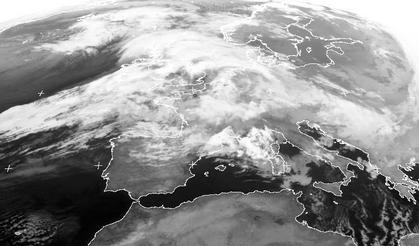 Das Satellitenbild zeigt ein Sturmtief mit Kern über Schottland, das noch Entwicklungspotential hat: man erkennt sehr schön die das zugehörige Frontensystem, und die kalte Luft auf der Rückseite hat den Kern noch nicht umrundet. Vom Balkan zieht sich ein Wolkenband weiter in Richtung Ukraine. Es markiert die Vordergrenze eines Kaltluftvorstoßes über Osteuropa.