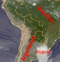 Auf dem heutigen Satellitenfoto zeigt sich das südamerikanische Land Uruguay weitgehend bedeckt, hier kommt es heute zu teils kräftigen Schauern oder Gewittern, auch im südlichsten Brasilien und im östlichsten Argentinien kommt es gebietsweise zu Schauern oder Gewittern. Sonst ist es in weiten Teilen Südamerikas heiter und trocken.