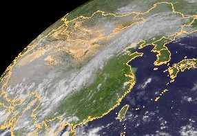 Das Satellitenbild von China zeigt einen breiten Streifen eines Tiefdrucksystems, in diesem Bereich sind verbreitet kräftige und teils ergiebige Niederschläge möglich.